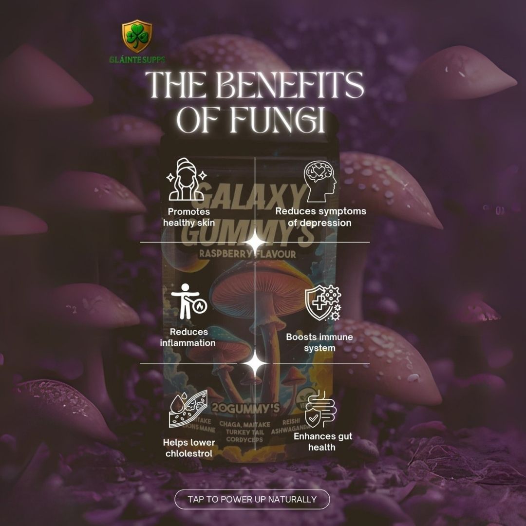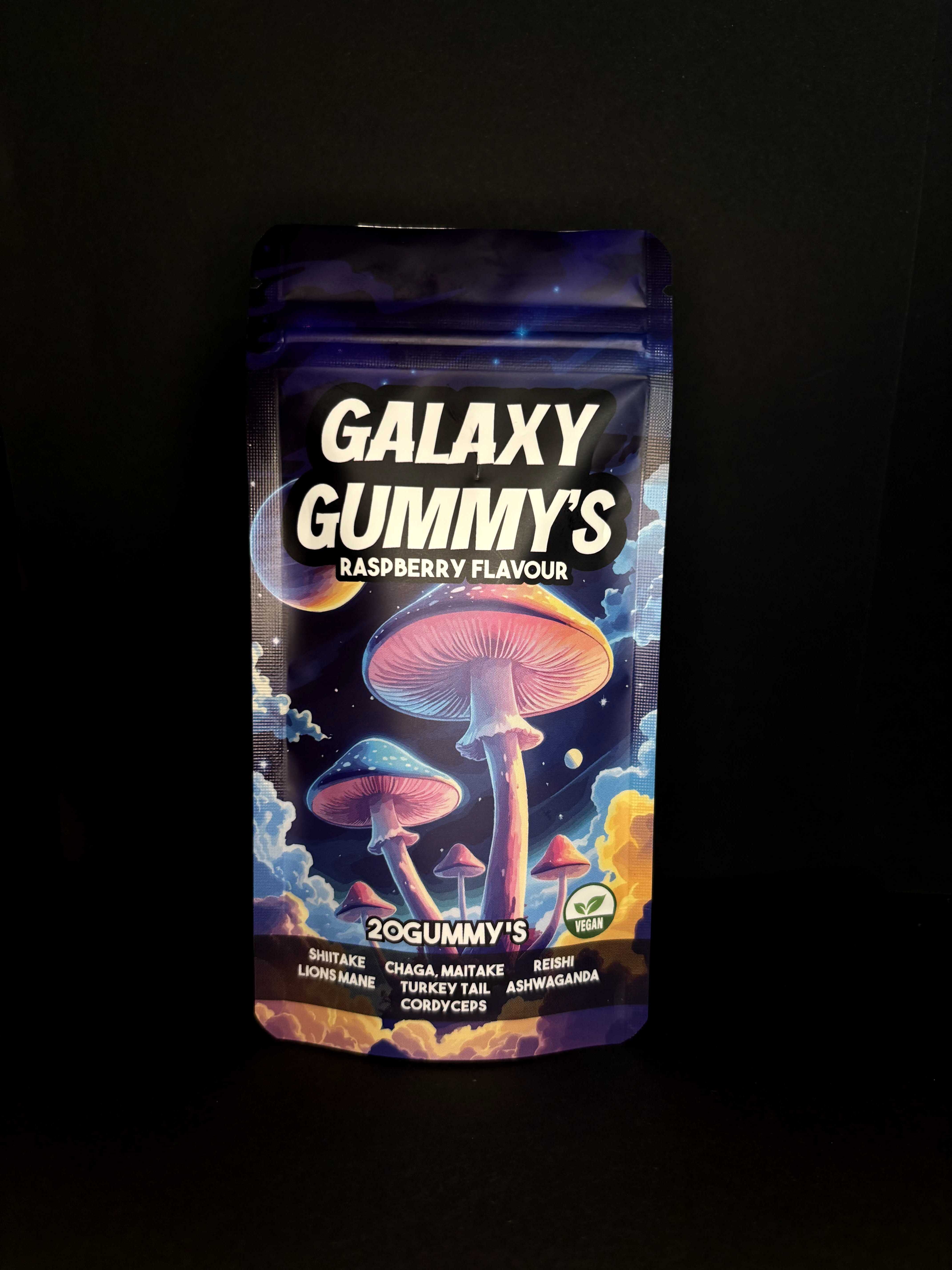 Galaxy Gummy’s are expertly formulated vegan gummy’s infused with a powerful blend of functional mushrooms and adaptogens, designed to support daily performance, clarity, and resilience. Each raspberry-flavoured gummy combines key natural ingredients including Lion’s Mane, Cordyceps, Ashwagandha, Reishi, Chaga, Maitake, Turkey Tail, and Shiitake—offering a synergistic dose of cognitive, immune, and mood support.
